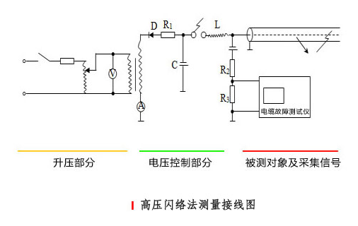 上圖是電纜故障測試儀針對電阻大于200歐姆以上的測量方法,閃絡沖擊法,通過施加直流高壓電壓,是故障點產生放電,并接收放電聲音。