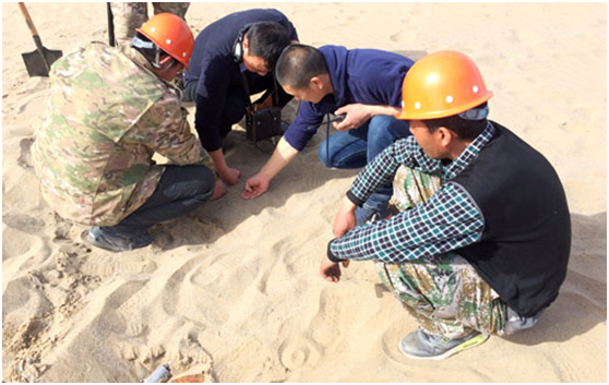 上圖是采用高壓法測量電纜故障,客戶在現場明顯感觸到振動的聲音,由于是沙層結構,相對比較容易發現,如果是硬質土壤,就需要用聲磁同步器接收,產生的效果一致。