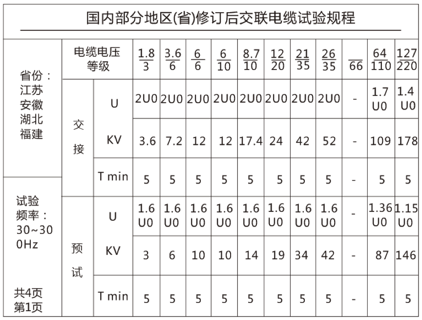 絕緣預(yù)防性試驗是保證電力系統(tǒng)設(shè)備可靠運行的重要手段,交流耐壓試驗是檢驗設(shè)備絕緣狀況的重要手段,也是絕緣預(yù)防性試驗的重要類容,目前主流的電纜交流耐壓設(shè)備有變頻串聯(lián)諧振裝置,下文我們列舉國內(nèi)相關(guān)省份對XLPE交聯(lián)聚乙烯電纜的耐壓試驗規(guī)程。