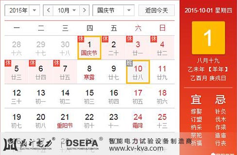 按照《國(guó)務(wù)院辦公廳關(guān)于2015年部分節(jié)假日安排的通知》規(guī)定,結(jié)合鼎升電力實(shí)際情況,經(jīng)公司研究決定,鼎升電力2015年國(guó)慶節(jié)放假時(shí)間為:共7天,10月1日(周四)至10月7日(周三)。10月8日(周四)至10月10日(周六)正常上班。注:9月28日(周一)調(diào)休至10月10日(周六)上班。