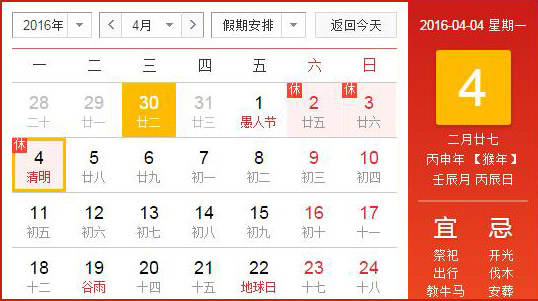 根據《國務院辦公廳關于2016年部分節(jié)假日安排通知》,鼎升電力2016年清明節(jié)放假安排如下:一、2016年4月4日是清明節(jié),星期一,農歷是二月十八。清明節(jié):4月2日至4日放假,4月2日(星期六),4月4日放假,與周末連休。