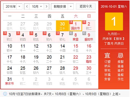 一、鼎升電力各部門員工2016年國慶節(jié)放假7天,即10月1日至10月7日。10月8號(星期六),10月9號(星期天)正全體員工常上班。其中,10月1日(星期六)、10月2日(星期日)、10月3日(星期一)為國慶節(jié)法定節(jié)假日。
