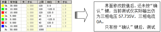 首先選擇“手動”試驗方式,在試驗輸出狀態下,依次直接修改所需改變的各相的參數(幅值或相位)。按“確認”鍵之前,盡管界面上的數據已經修改,但測試儀實際輸出的電壓電流還是修改前的。全部修改完后按“確認”鍵,測試儀的各相輸出立即同時改變為修改后的值。由于這種改變是各相同步改變的,所以能適應某些突變量起動的保護的輸出要求。