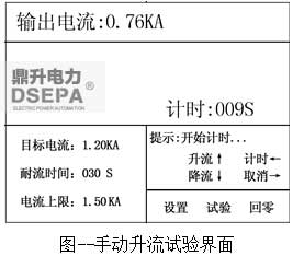 在升流過程中,如果輸出電流有效值超過“電流上限”值將認(rèn)為短路事故,接觸器立刻分閘并顯示試驗(yàn)結(jié)果,包括輸出電流的最大有效值、耐流時(shí)間等,調(diào)壓器開始回零,回零完成試驗(yàn)結(jié)束。如果在耐流過程中,如果輸出電流有效值沒有超過電流上限,計(jì)時(shí)結(jié)束后,結(jié)果顯示區(qū)就顯示平均輸出電流、耐流時(shí)間等,調(diào)壓器開始回零,回零完成后接觸器分閘試驗(yàn)結(jié)束。