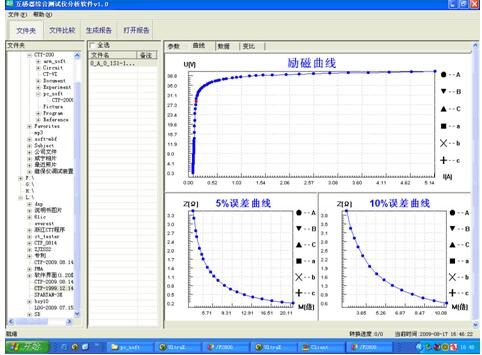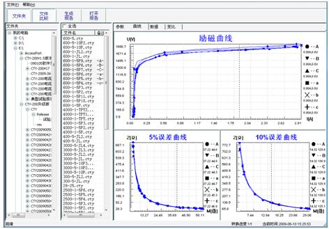 •PC機操作軟件曲線頁曲線頁(圖3.1)顯示勵磁曲線、5%誤差曲線、10%誤差曲線。最多可以顯示6個源文件的6條曲線,由6種不同形狀的圖標(biāo)指示,可以方便地進(jìn)行比較。曲線中的坐標(biāo)點是根據(jù)源文件中的數(shù)值自適應(yīng)確定的。在繪圖有效區(qū)域內(nèi)移動鼠標(biāo),程序會根據(jù)X軸坐標(biāo)點自動計算Y軸坐標(biāo)點的數(shù)據(jù),顯示在右側(cè)對應(yīng)的圖標(biāo)下。