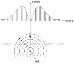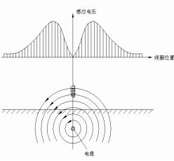 根據(jù)電磁理論,交變的電流在空間產(chǎn)生一變化的磁場,其關(guān)系滿足安培環(huán)路定律。如果周圍是均勻介質(zhì),加載交流電流的導(dǎo)體足夠長、直時(shí),在該導(dǎo)體周圍產(chǎn)生一個(gè)同軸的交流電磁場,磁場強(qiáng)度的大小正比于電流,反比于到導(dǎo)體的距離。如將一線圈置于這個(gè)磁場中,在線圈內(nèi)將感應(yīng)產(chǎn)生一個(gè)同頻率的交流電壓,感應(yīng)電壓的大小取決于該線圈在磁場中的位置,當(dāng)磁力線方向與線圈軸向平行時(shí),線圈感應(yīng)的電壓水平分量呈極大,如圖1所示;當(dāng)線圈軸向與磁力線方向垂直時(shí),感應(yīng)的電壓水平分量最小,為極小值;如圖2所示。地下管線探測儀正是利用這一特點(diǎn)實(shí)現(xiàn)埋于地下的管線的路由查找。這兩種極大值、極小值的探測方法即對應(yīng)測量路由的峰值、谷值法。