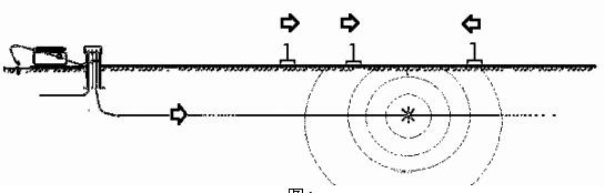 采用DFGX-H地下管線探測儀的絕緣故障查找功能(FF)便可夠迅速及時地檢測出管線的絕緣故障點。發(fā)射機采用直接注入工作方式,將故障查找的專用信號加至管線上,如圖4所示。信號在故障點處通過大地向外泄漏,電位大小則以故障點為中心,球面型徑向地非線性衰減。將與接收機相連的輔助故障查找支架插入地表面,獲取泄漏的信號特性,即可測量出故障點所在方向。按接收機顯示的指示箭頭,通過多次的反復,最終便可查找出泄漏信號的故障點。