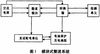 直流操作電源設(shè)備的整流方式不論如何變化,它的系統(tǒng)原理是基本相同的,都包含有整流、蓄電池充電、直流饋出、檢測報警等部分。如果用高頻開關(guān)模塊式整流,我們可以從系統(tǒng)原理圖轉(zhuǎn)化為模塊式整流系統(tǒng)圖,見圖l。模塊式整流系統(tǒng)圖就是輸入交流電壓,經(jīng)過變頻開關(guān)模塊整流后,變?yōu)楦哔|(zhì)量的直流電壓輸出。而這種模塊式的整流,能提高輸出直流電壓的穩(wěn)定性,還能減少紋波系數(shù)。同時,模塊式整流是N+l冗余配置,在模塊故障或退出情況下,N+1配置的整流模塊仍能正常工作,均流功能不受任何影響。