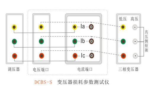 測量時,使用DCBS-S變壓器損耗參數測試儀將低壓短路,高壓側輸入電源,通過手動或自動施加電壓(低壓線圈中的電流達到他的額定電流時的高壓電壓),除以高壓的額定電壓,我們就得到了阻抗電壓百分比,此時低壓和高壓線圈的電流都達到額定值,我么即可得到變壓器的負載損耗(銅損)值,下面我們看一下具體如何接線。