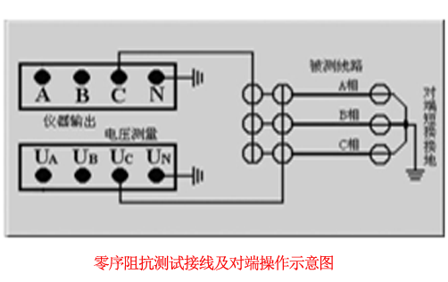 零序阻抗(零序短路)測試時,通過儀器內部的控制回路切換測試信號連接方式,儀器測量端三相短接,儀器只輸出一相測試電源到被測線路上。將對端線路短接,并可靠接至大地。下圖所示: