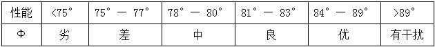 考慮到δ=90°—Φ相當(dāng)于介損角,直接用Φ評價MOA也是十分簡捷的:沒有“相間干擾”時,Φ大多在81°— 86°之間。按“阻性電流不能超過總電流的25%”要求,Φ不能小于75.5°,可參考下表對MOA性能分段評價: