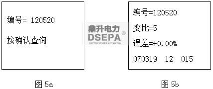 操作者輸入要查詢的編號(hào),按[確認(rèn)]鍵開始查詢,如有數(shù)據(jù)顯示如圖5b,內(nèi)容依次為編號(hào),變比,誤差,時(shí)間,人員,存儲(chǔ)序號(hào)。