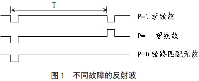 電纜故障測試儀提供的時鐘信號可測得時間T。因此線路故障點的距離Lx便可由(2)式求得。不同故障時的波形圖如圖1所示。