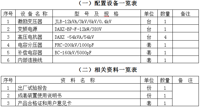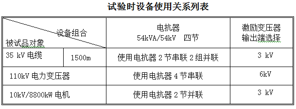 結論:串聯諧振裝置容量定為216kVA/216kV,分四節電抗器,電抗器單節為54kVA/54kV/1A/80H通過組合使用能滿足上述被試品的試驗要求。