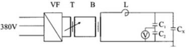 其中:VF表示變頻電源,T表示調壓器,B表示中間變壓器,L表示高壓電抗器,C1、 C2表示分壓器電容,Cx表示試驗電纜,V表示電壓表。