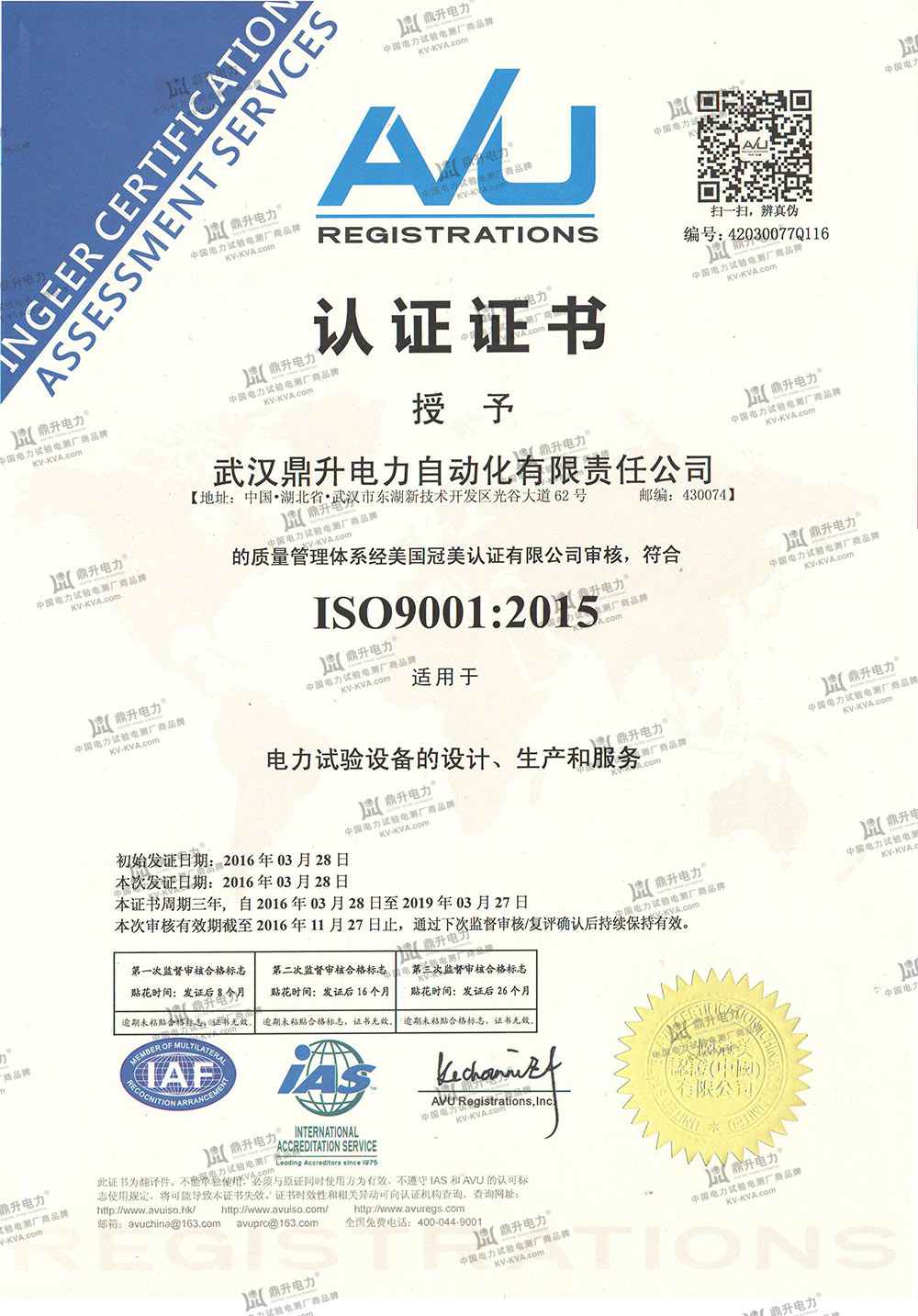 鼎升電力公司將嚴格按照ISO9001-2015的國際質量體系標準進行生產(chǎn)管理。不斷以完善的服務和先進的技術為電力系統(tǒng)預防性試驗事業(yè)作出更卓越的貢獻。實施ISO9001標準,協(xié)同新的發(fā)展戰(zhàn)略,有效促進組織質量管理體系的改進和完善,對公司國際經(jīng)濟貿易活動、消除貿易技術壁壘、提高公司的管理水平都起到良好的作用。